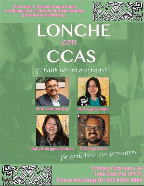 Join our February Lonche con CCAS with Professors Matt Barreto and Karina Alma and CCAS presenters Gaby Rodriguez-Gomez and Christian Duran. Lonches con CCAS is a monthly Brown Bag workshop for CCAS graduate students. Faculty “hosts” guide two CCAS presenters and their attendees through discussions of works-in-progress.
